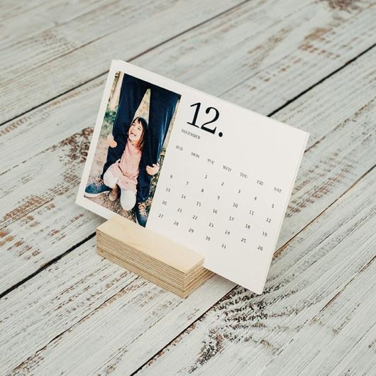 Un calendario original que, además de ser funcional, decorará cualquier escritorio. El conjunto de sus hojas pueden ser personalizadas con diferentes fotografías, una para cada mes. Las hojas se sostienen en un elegante bloque de madera calara y están disponibles en diferentes formatos.